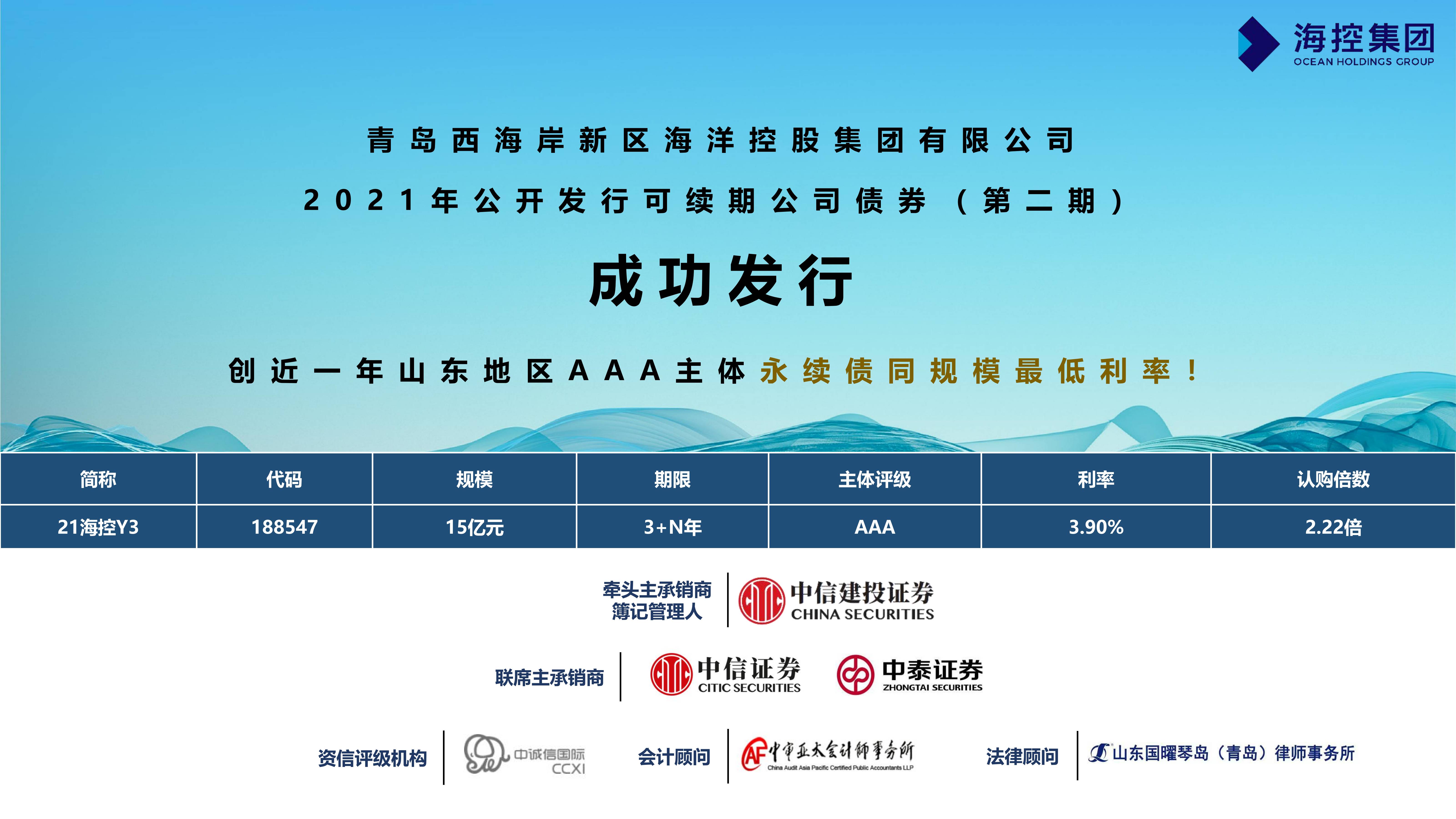 8月30日,海控集團“2021年公開發行可續期公司債券(第二期)”成功發行,期限3+N年,發行金額15億元,發行票面年化利率3.90%,創近一年山東地區AAA主體同規模最低利率。