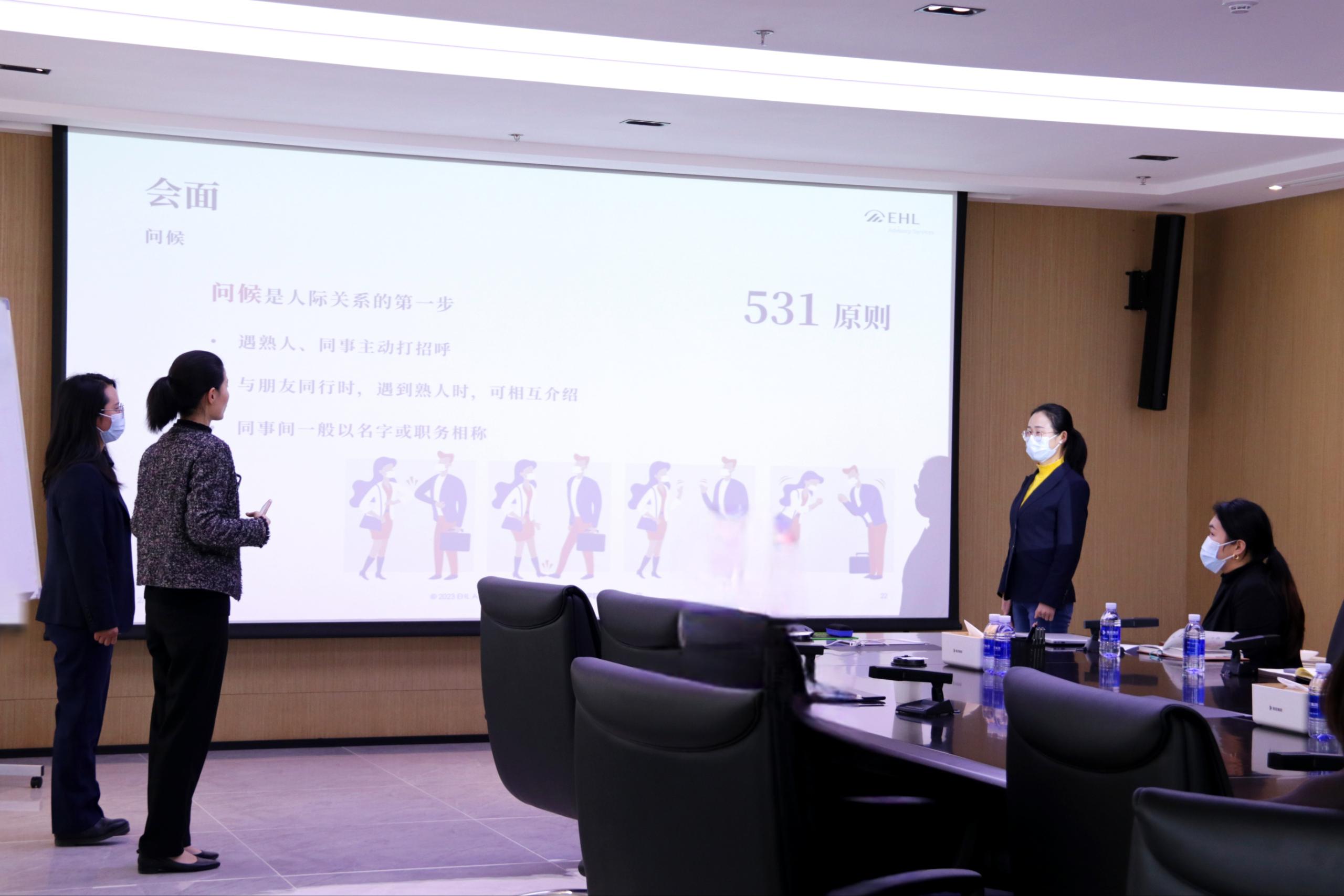 此次培訓邀請了洛桑酒店管理學院集團咨詢公司顧問呂堃講師、助理顧問謝一晗講師針對商務禮儀進行授課。在培訓中,兩位培訓講師采取理論教學和現場互動實踐相結合的方式。一方面,通過援引事例生動闡釋商務禮儀的概念、作用、行為標準等理論知識;另一方面,通過場景模擬實踐、特定情境互動表演等環節詳細示范和訓練禮儀規范。參訓人員即學即練,在現場實踐互動中加深了對商務禮儀的理解和把握。